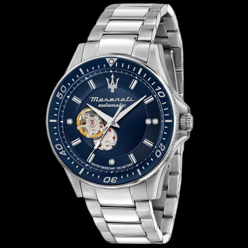 Maserati Model R8823140004 featuring automatic 24-Jewel Japan movement, 4 diamond accents and stunning open heart dial in rich royal navy. 100m water resistance, analog glass back case, screw down crown and mineral sapphire crystal. Case 44mm Band 22mm. Was $550 now $400