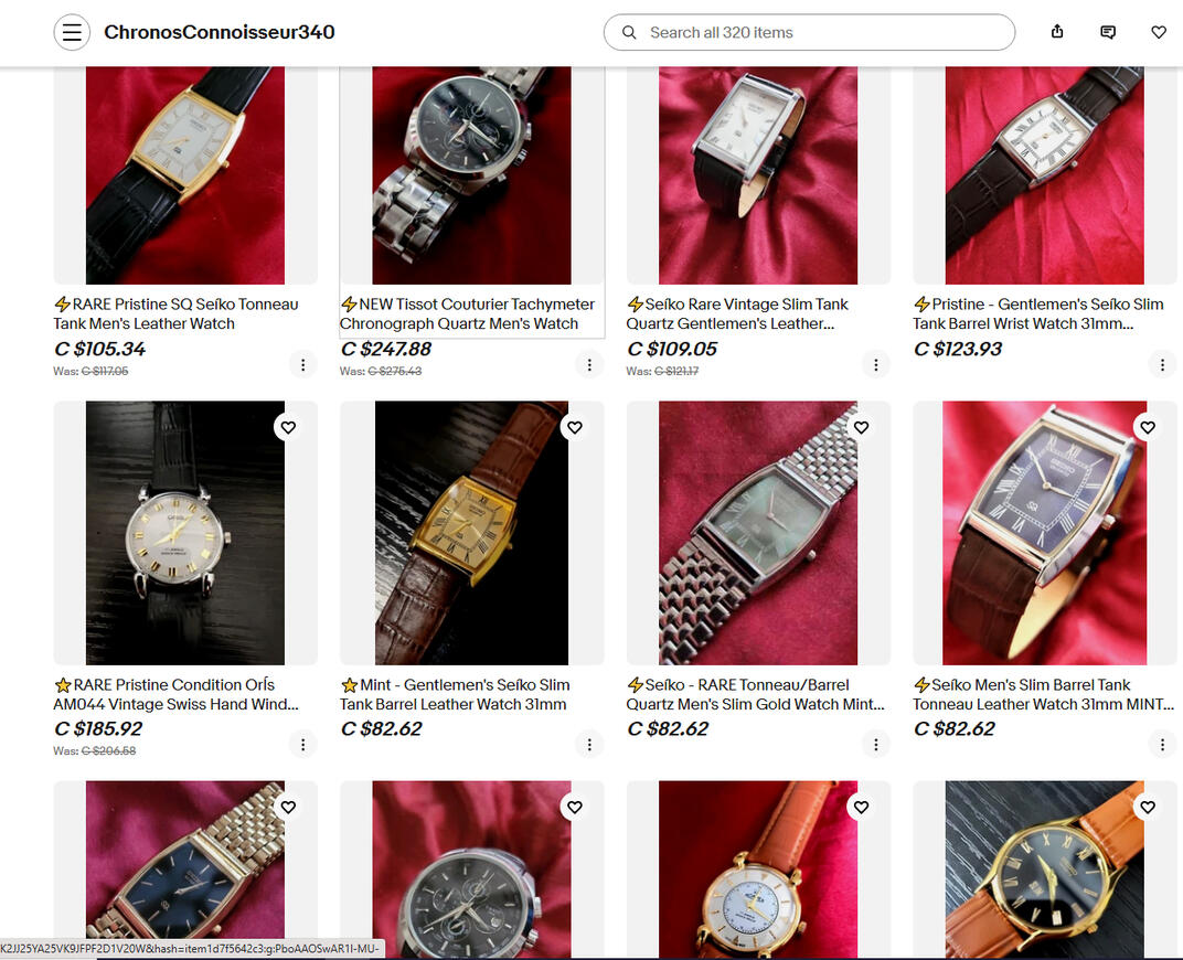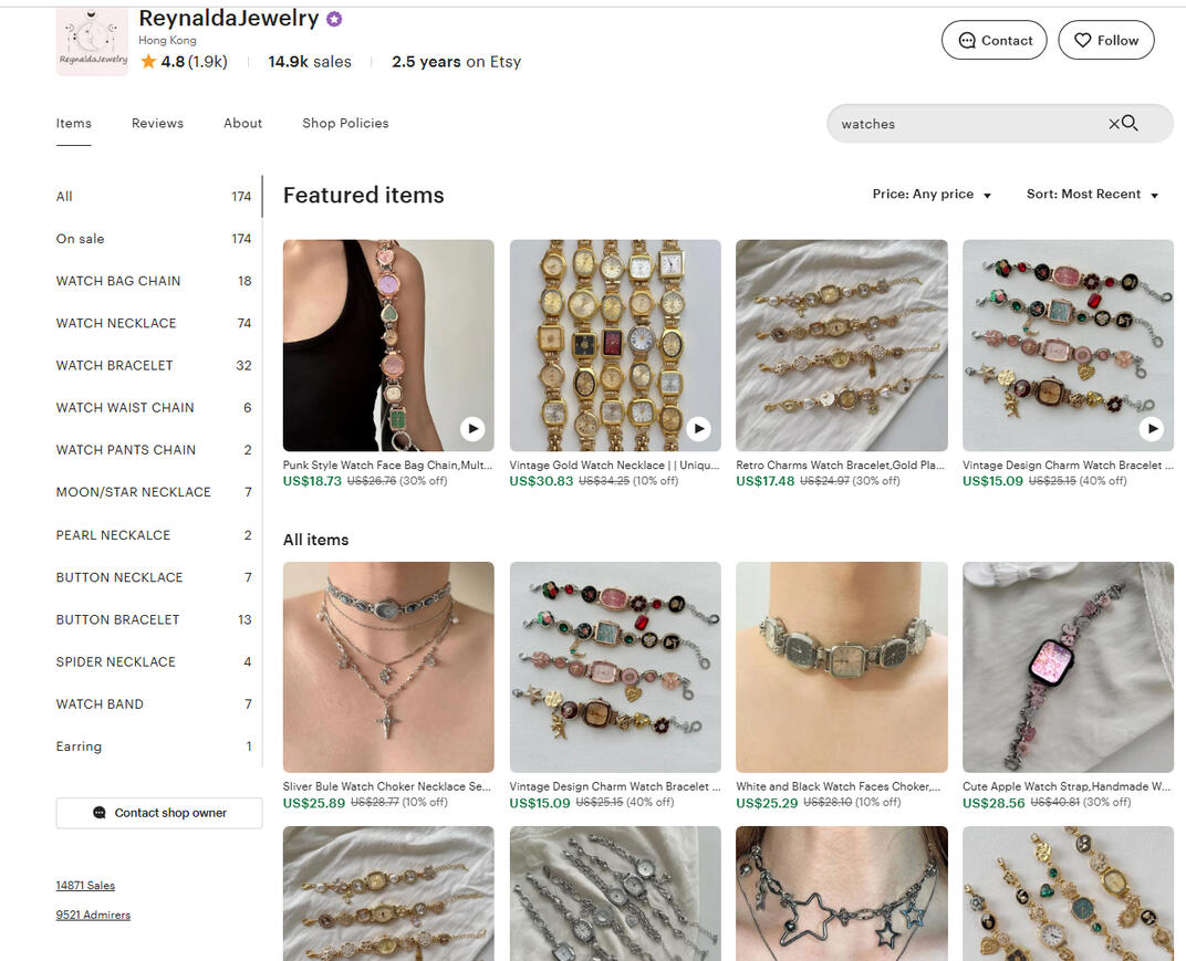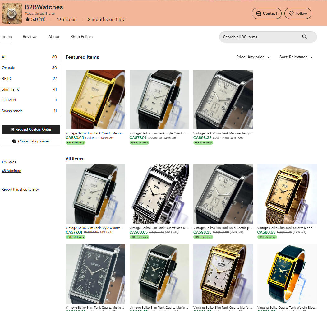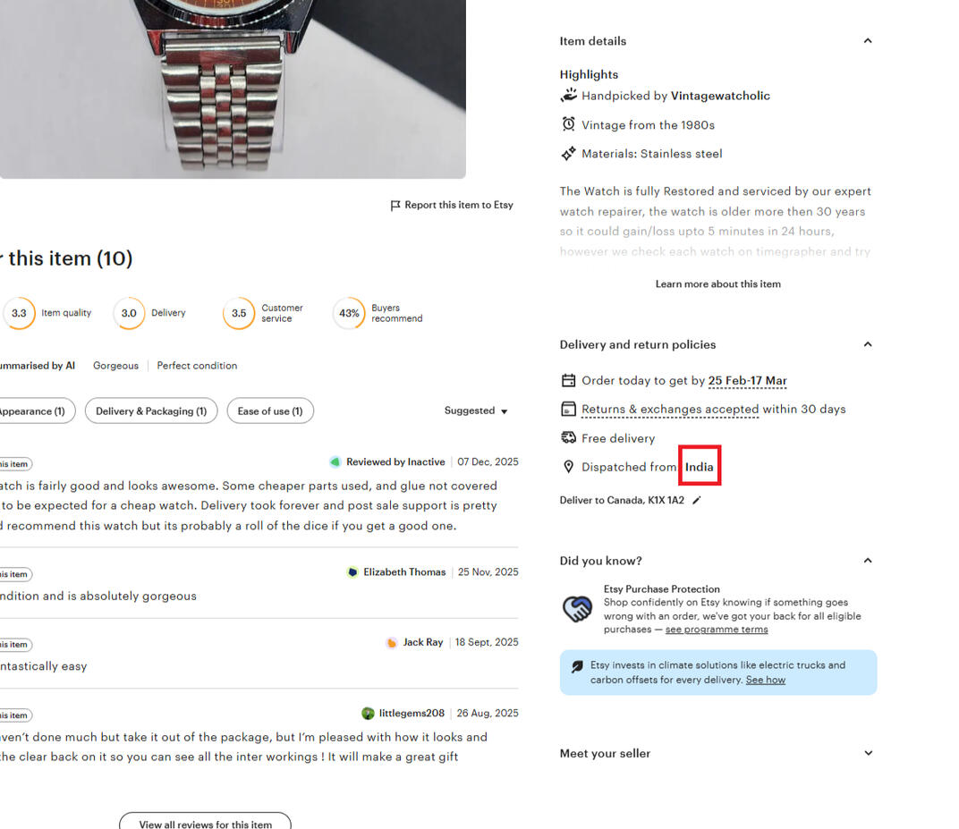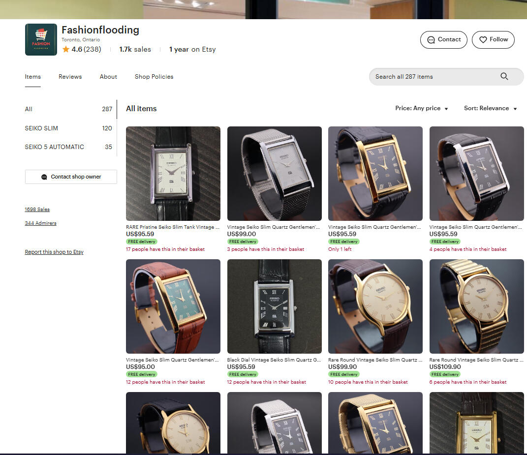 This scammer, Reynalda, makes almost $200,000 per year (US) selling brand new mass produced watches with China movements. In fact, they're shipped from Hong Kong but probably mass produced in China. They use the "word scam" using words like "vintage", "handcrafted". Everything in the ad is a lie. Etsy makes 25%, which is about $45,000 per year off this one scammer! But consumers don't care either, caring only about gobbling up cheap items. Etsy supposedly has rules about what can be sold, such as handmade, vintage or craft, but as long as you use the right words, you're good to go scamming!