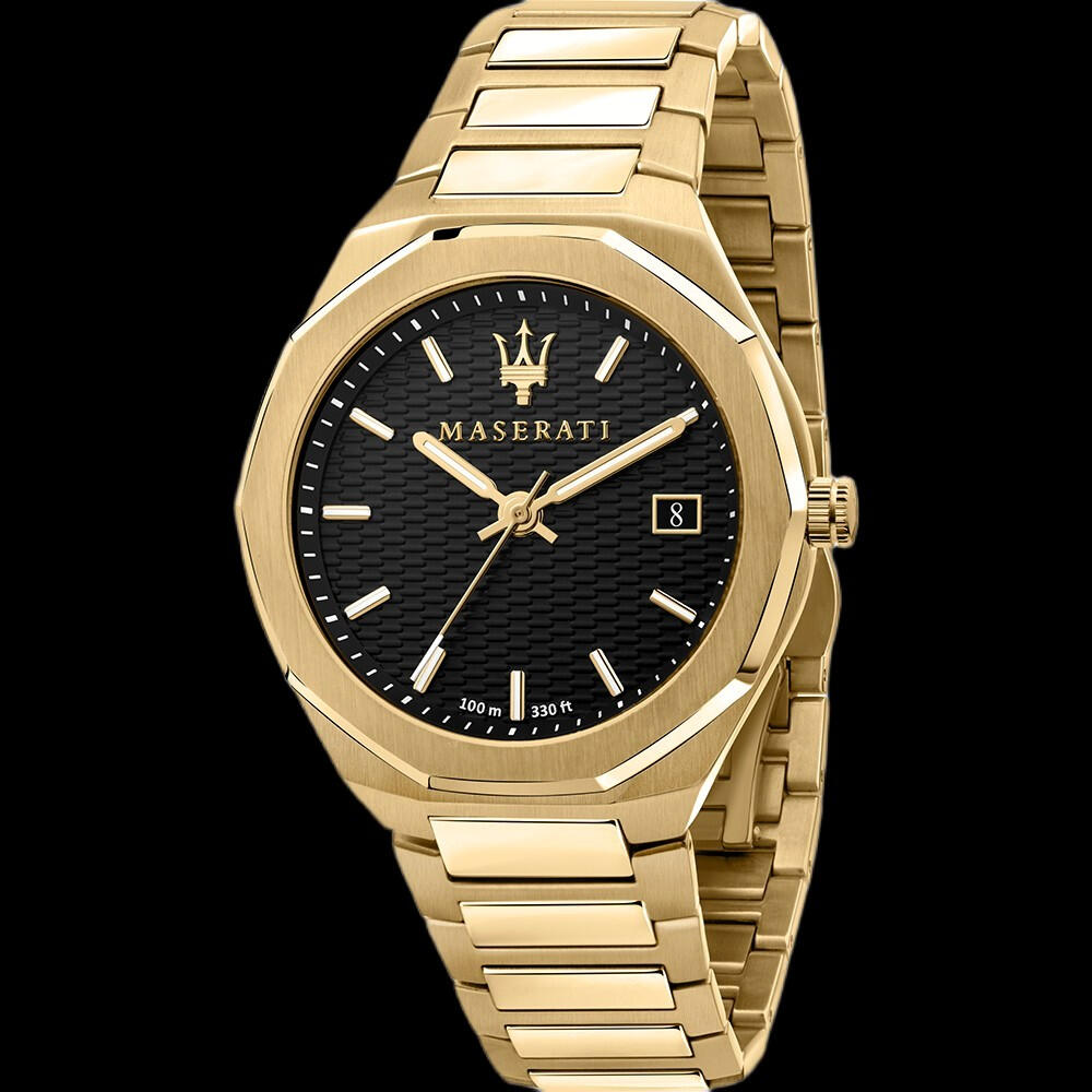 Featuring date display at 3 position and luminescent hands and markers, Japan movement, in classic gold and black. 50m water resistance, screw down crown and mineral sapphire crystal. Case 42mm Band 22mm. Band can be changed to any in-stock leather, metal, mesh or nylon band. Message me with your preference. Comes with Maserati watch box. Was $450 now $335