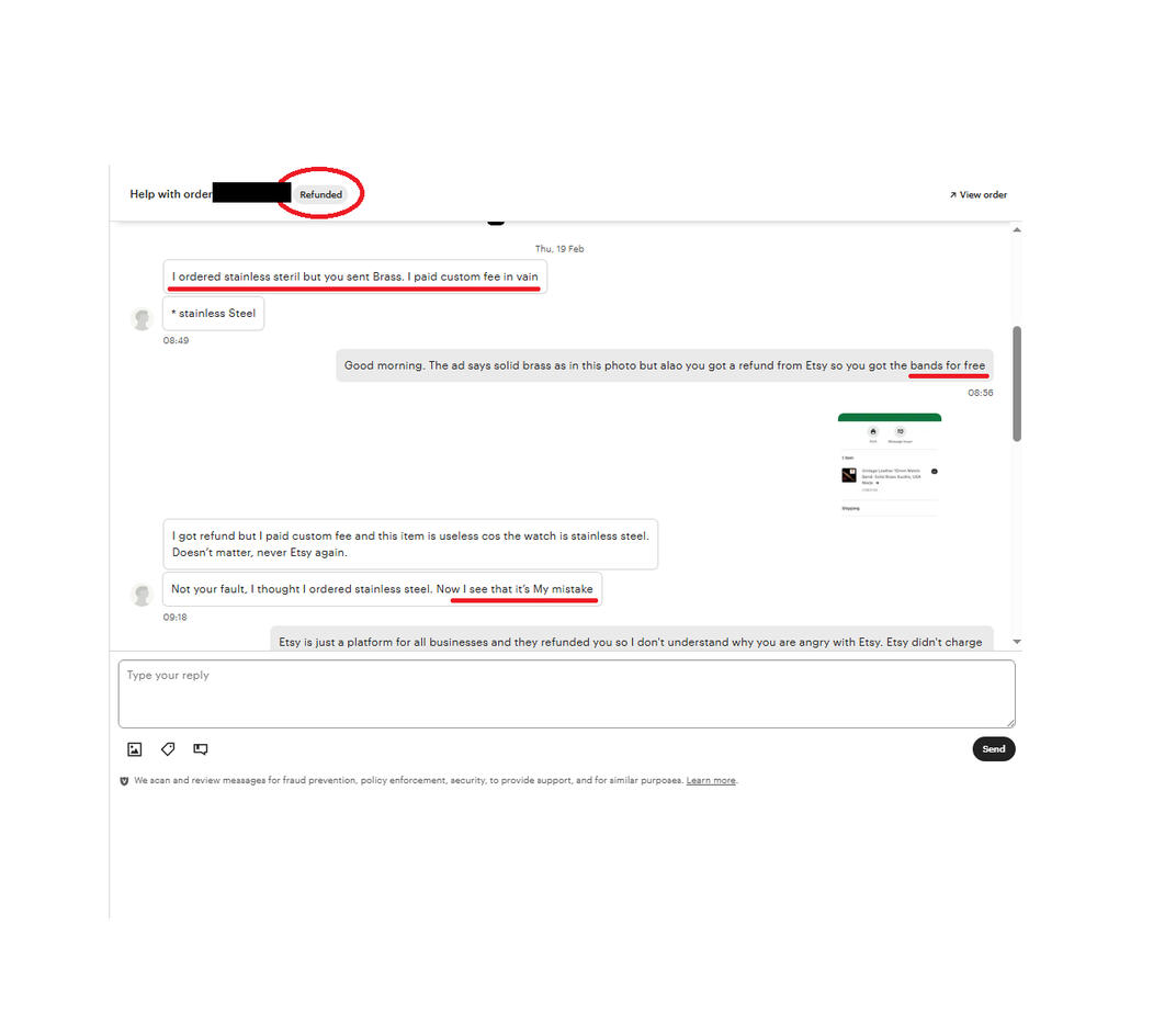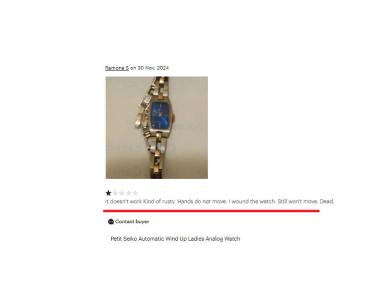 Theft by Refund Abuse-This fraudster was not successful because I thwarted her plan to rob Etsy by sending her a prepaid return label for full refund after she started her plot with a fake bad review. She tries to photograph the watch in dark light to validate her "rusty" claim but I polished that watch so much, it was impossible to lie about that !